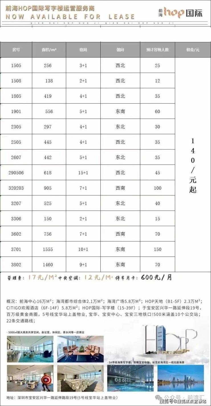前海HOP国际:位于深圳市宝安区新安街道兴华一路19号,与地铁5号线宝华站无缝衔接,项目四大产品主线包含:5.8万平方米前海HOP天地购物中心、5.8万平方米HOP国际写字楼,2.3万平方米CitiGO欢阁酒店及2.1万平方米HOP海湾广场,地下配备约1000个停车位。