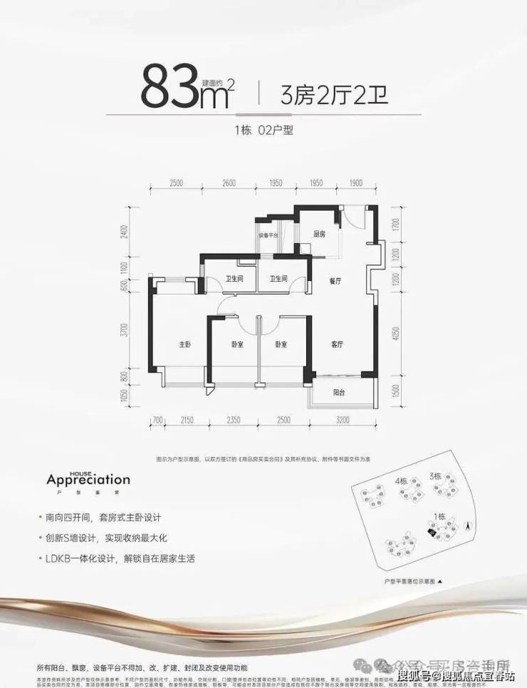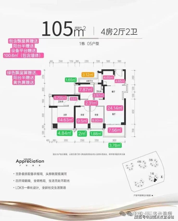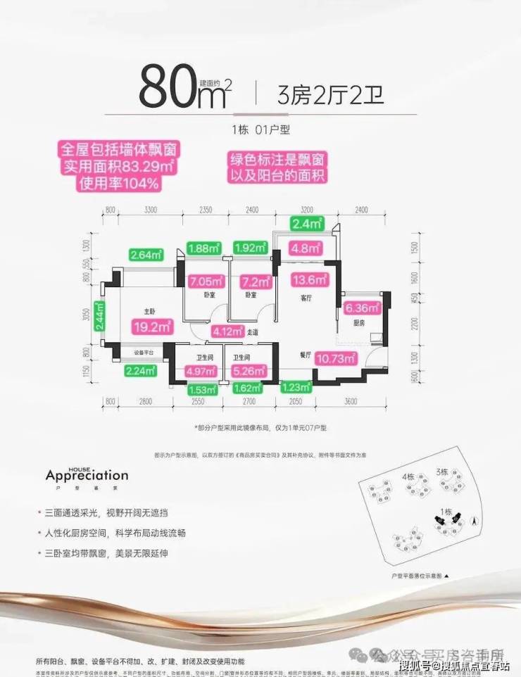 项目主推建面约72-105㎡的3-4房,根据户型测算,产品基本在98%使用率,最高实用率甚至能突破100%,相较于新规前普遍75%左右的得房率,堪称是“王炸”级别的存在!