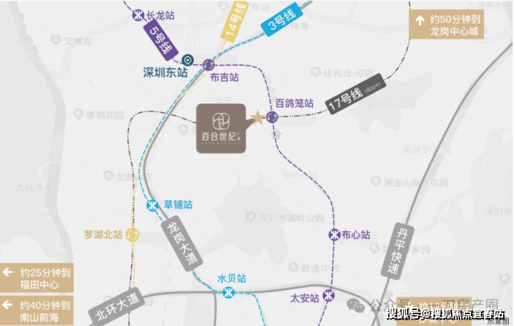 【交通】百合世纪广场紧邻地铁5号线百鸽笼站(步行约100米),且未来规划有17号线罗岗站约450米在此交汇通过地铁5号线,1站可换乘3/14号线,4站直达福田核心区,7站快速通达深圳北站。1 公里接驳龙岗大道,2.5 公里直达丹平快速。
