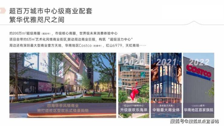 四华侨城四海华亭自带约5万㎡艺术风情商业街区,涵盖餐饮、零售、娱乐等业态,打造“超级活力中心”。项目周边1公里内汇聚港铁天颂TIA颂荟、壹方天地(深圳最大型商业体)、红山6979等商圈,2公里范围内覆盖华南首个Costco(已开业)、天虹商场等,形成约200万㎡超级商圈网络,满足全维度消费需求。此外,片区规划中洲、华润等旧改项目,未来商业能级将持续提升。