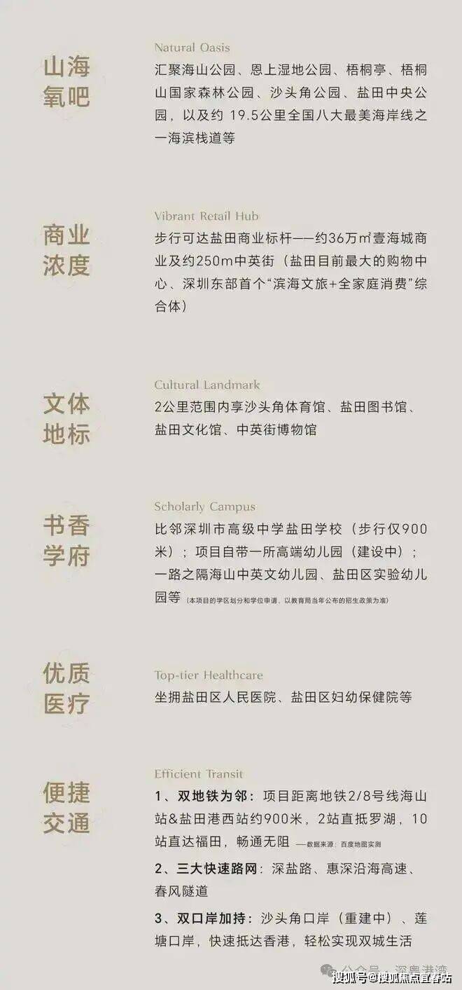 中小学:深圳市高级中学盐田学校(九年一贯制)距离项目仅 900 米,隶属深圳“四大”名校深高集团,提供约2600个优质学位,采用 GLOBE 教学体系,与集团内成熟校区师资互动,硬件设施包括恒温游泳池、网球场等。该校学区明确包含该项目,实现“目送式教育”