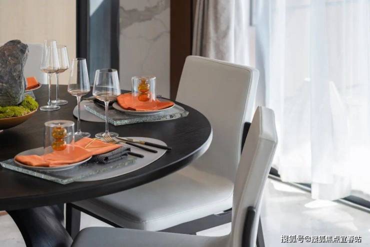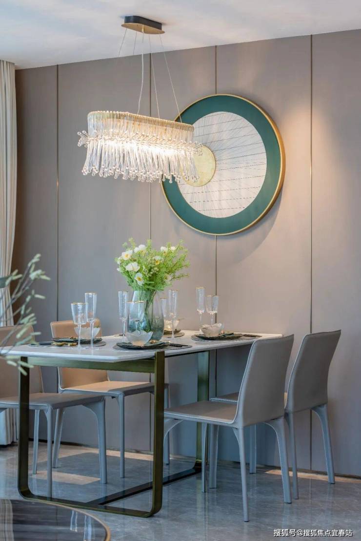 大理石面餐桌,天然大气,底足钢结构支撑,留足腿部空间。越过台面,水晶灯体伴暖色光源照耀餐区,微妙的半透明波纹玻璃餐具,无不增添生活情怀。