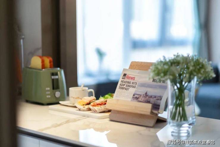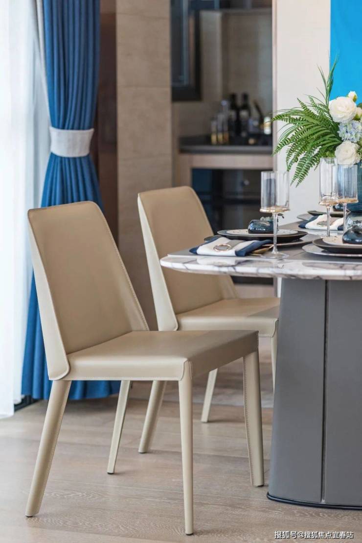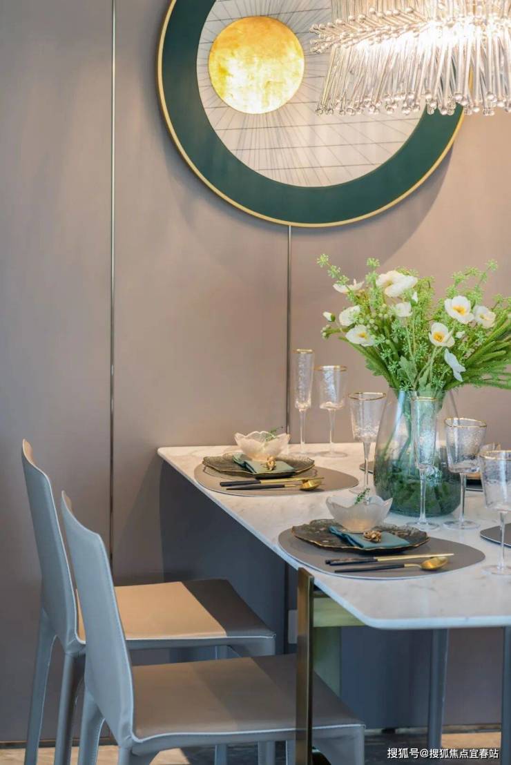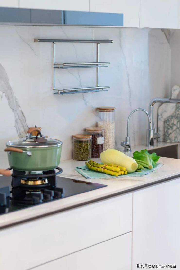 大理石纹理的餐桌旁,借生趣的挂画以及摩登的杯樽餐具装点,别有一番雅趣。临餐厅是厨房区,丰富多样的调料与生动花艺,摆放出十足的生活烟火气。