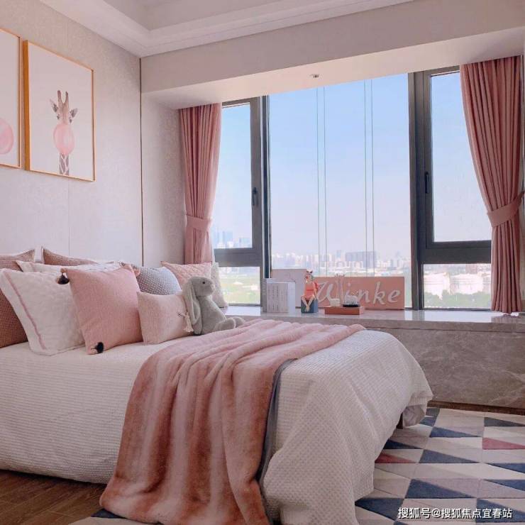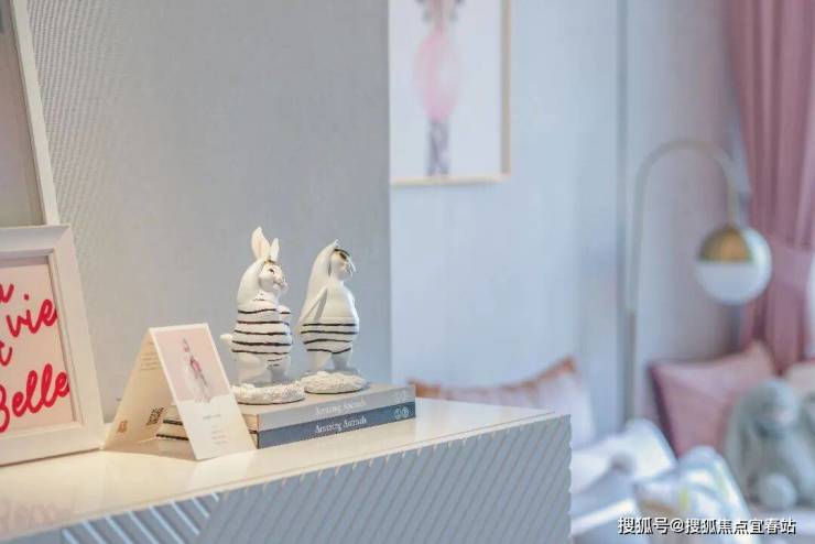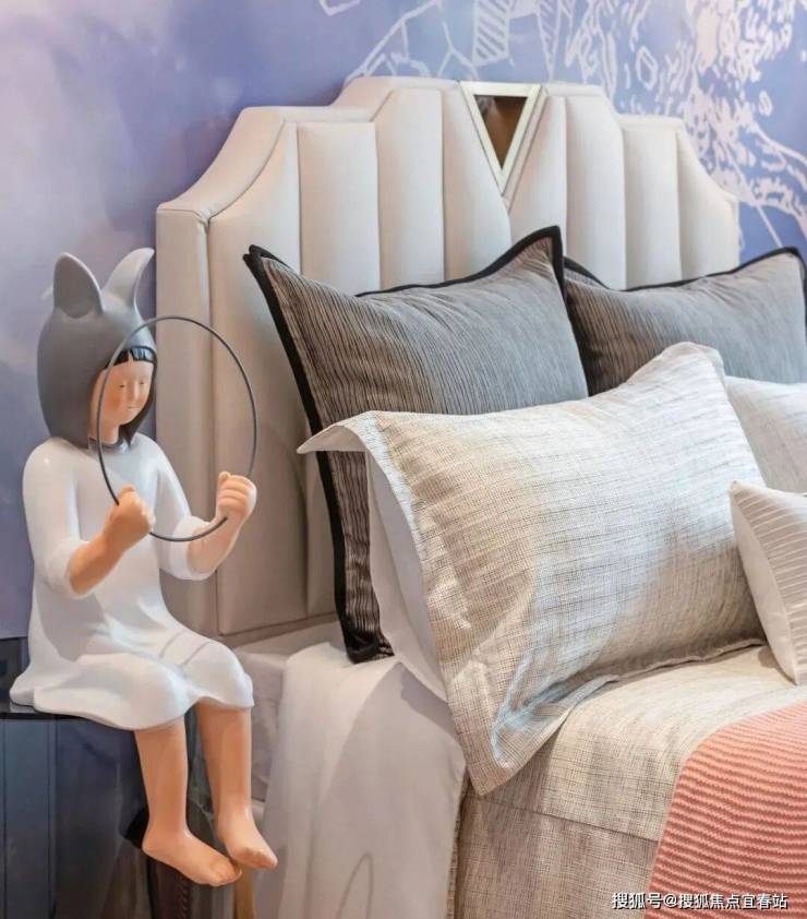 次卧的设计亦散发着梦幻的当代艺术气息。有序陈设的床品、摆件等小细节,营造出童真趣味的意境。