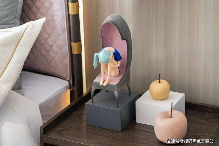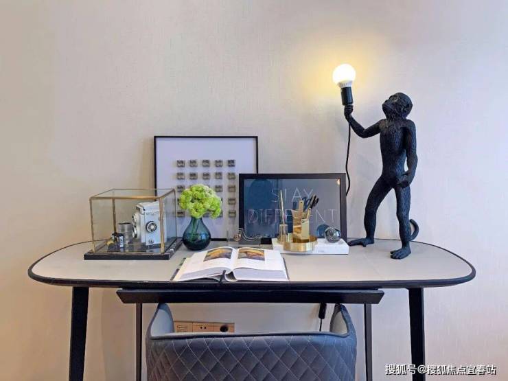书房书桌运用圆弧型台面,刚好满足小尺度空间的使用,窗台旁的一组彩色电镀玻璃坐凳及火柴人促成的小场景,体现了居住者独特的生活品味与情趣。