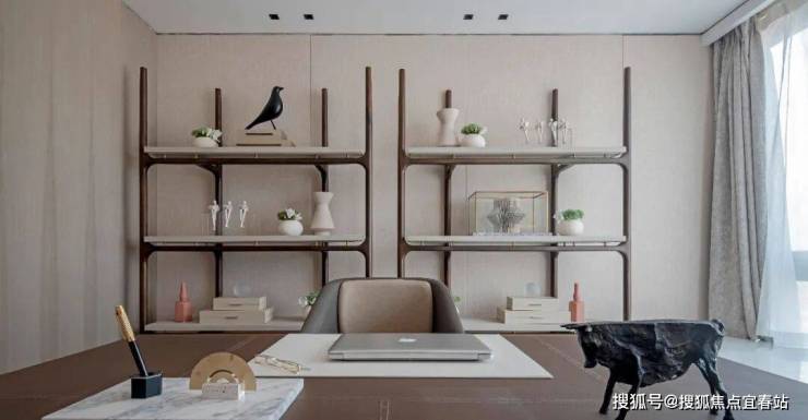 大量留白的空间让视觉放松下来,原木的搁架与工作桌质朴无华,精挑细选的饰品和人物瓷器摆件充满了文人墨客的情调,在瞬间便将现代社会快节奏的烦扰褪去一二,在家中为自己觅得一方精神绿洲。