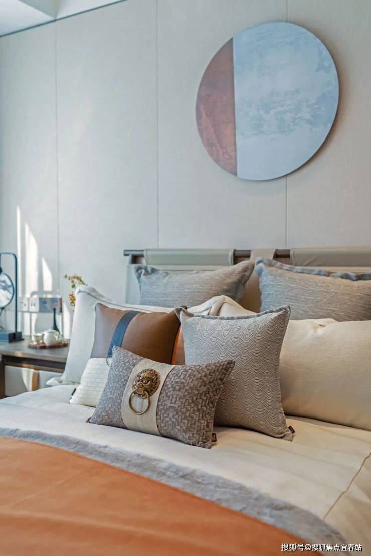 次卧空间的气韵清丽柔雅,配上传统门扣手的装置东方意味十足。墙面上的装置画是设计对东方语素的延展,金属蚀刻的粗狂被空间极致地展现出来,洒脱且随性。