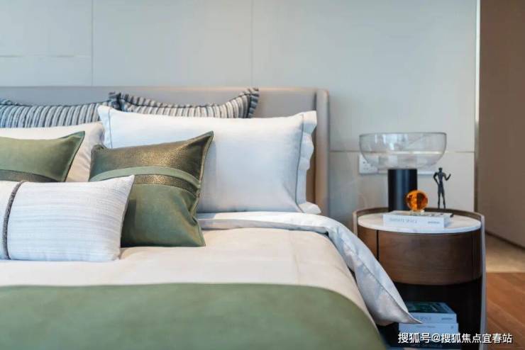 卧室的色彩哲学同样运用温柔清新的笔触营构。背墙硬包不甘平庸,与床品丰富的纹理配合,拼贴出时尚气质。