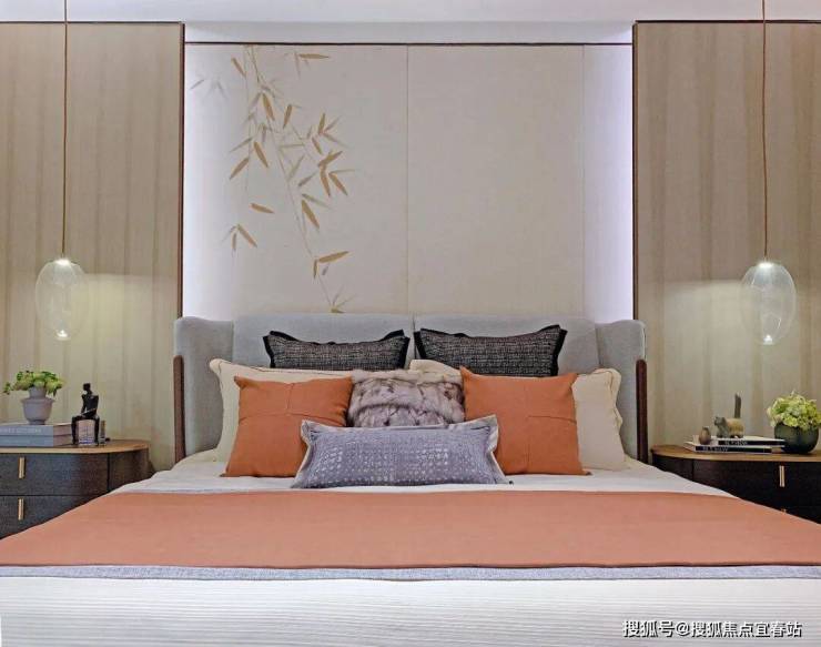 主卧空间是简洁质朴的设计,床背的竹叶刺绣在不露声色中流淌出涓涓禅意。棉麻、羊毛与木制搭配出细腻质感,带着浓浓古朴韵味的插花茶具小品修饰着空间。