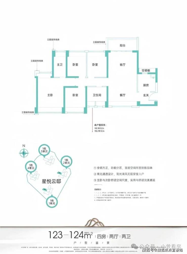 123㎡的4房2厅2卫,设计的竖厅南北通透格局,进门独立入户玄关,全屋飘窗设计,U型厨房,得房率:78.15%(不含赠送),阳台主朝东北向。