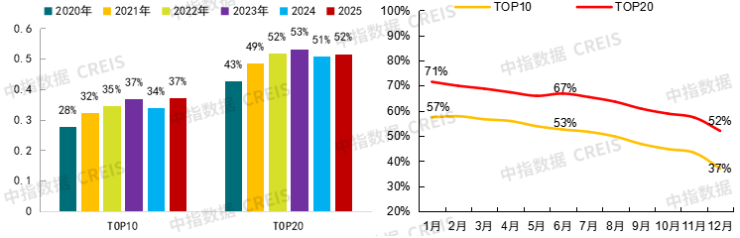 从城市集中度来看,根据中指数据,2025年,全国TOP20城市宅地出让金占全国比重为52%,较2024年全年小幅提升1个百分点,其中上半年TOP20城市出让金占比高达67%,下半年随着核心城市供地逐渐放缓,占比呈缓慢下行态势。TOP20城市中,16个城市为核心一二线城市,北京、杭州、上海土地出让金均超1400亿元,杭州前七月出让金已超2024年全年;成都超800亿元,武汉、苏州均超600亿元。