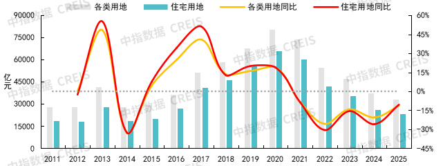 注:数据统计口径为公开招拍挂市场成交地块。自2025年起,中指数据扩大了300城土地覆盖范围,目前已涵盖全部地级及以上城市,历史数据为可比口径