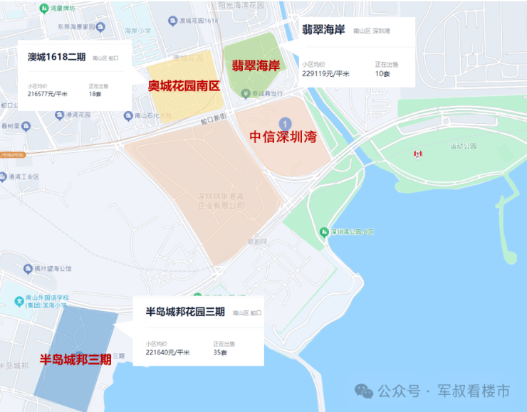 从价格来看,距离中信深圳湾目最近的小区:翡翠海岸、半岛城邦花园三期、奥城花园南区等二手房挂牌价均在22万/㎡左右(来源于贝壳),甚至巅峰期价格一度到达30万+/㎡。