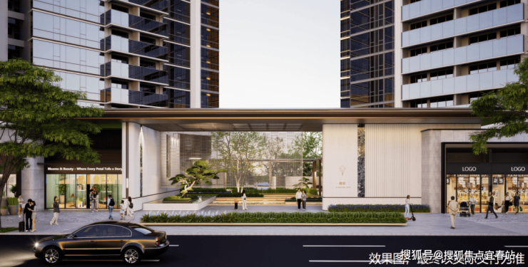 立面采用高端蜂窝铝板+天然石材+类玻璃幕墙,精致的金属勾边,毫米级幕墙工艺锻造,以“公建化立面”诠释高阶人居美学。