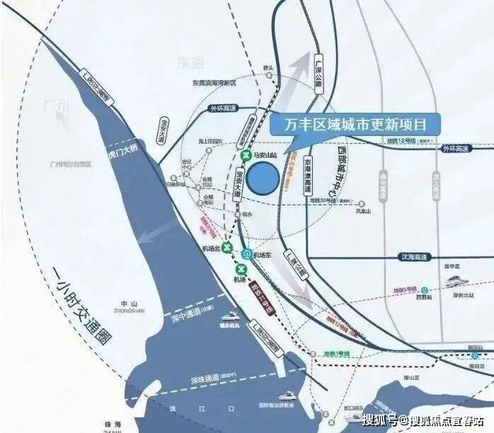 从宝安机场客运码头出发,可以到达香港、澳门、广州、珠海、中山5座城市。陆路交通已经形成“两横三纵”,“两横”是项目南北两侧的南环路、新沙路,“三纵”是项目西侧宝安大道、东侧中心路和107国道。高速方面拥有“四大高速”,广深高速、京港澳高速、广深沿江高速、外环高速等。深中通道预计2024年建成通车。