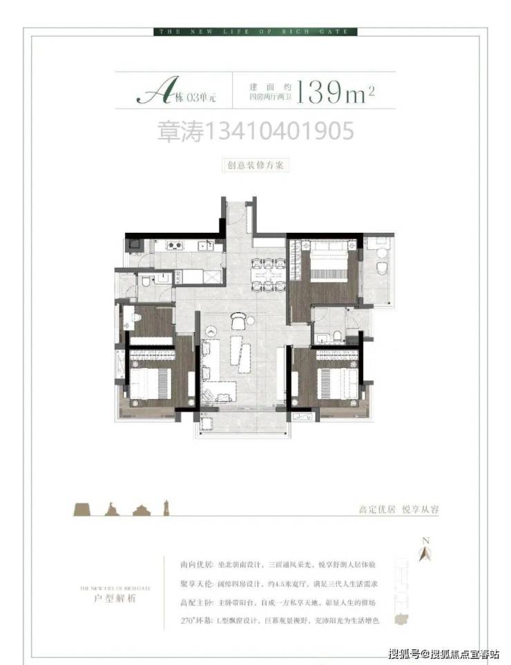 A栋03单元三面采光三阳台139㎡稀缺南向四房户型: