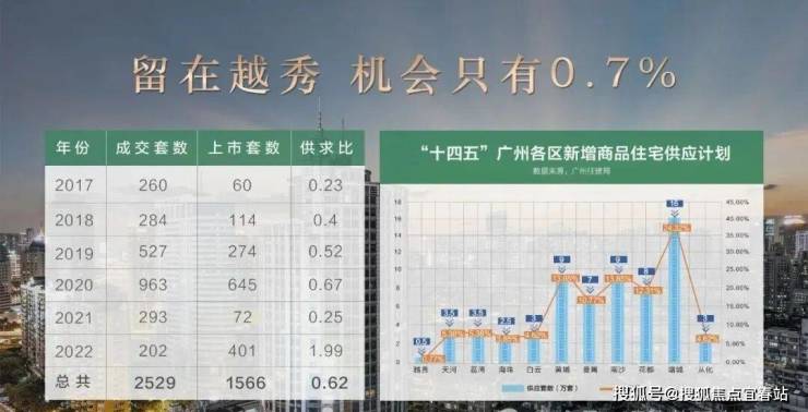 越秀区近十年几乎没有宅地放出,从过去六年的历史数据来看,新房平均供求比仅为 0.62,严重供不应求。在未来五年,越秀新房供应仅占全市的 1/130,而且在越秀区公园前,仅有君熙府这一座。