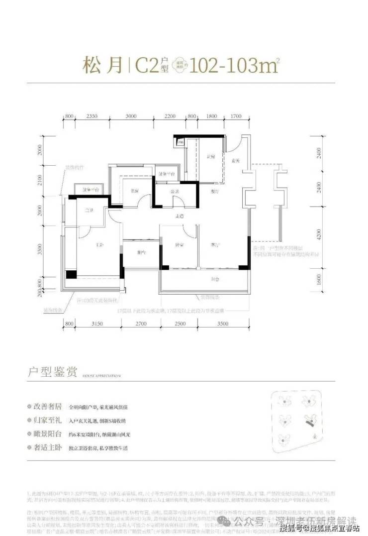 102-103㎡的4房2厅2卫(C1-C2户型),设计的是经典竖厅格局,进门入户玄关,客厅3.5米开间,LDKB一体化,S墙设计预留冰箱卡槽位,动静分区,四开间朝南,4个卧室分别做到了主卧17.98㎡/次卧8.37㎡/次卧8.1m²/次卧7.75㎡(包含墙体飘窗),L型厨房,公卫干湿分离带1个约2m²的设备平台,得房率约81%(不含赠送),客厅连接次卧出9.6m²的观景大阳台,东南或西南朝向。套内面积83.43m²+赠送面积23.86m²=实际使用面积107.29m²,加上赠送后得房率约104.16%。