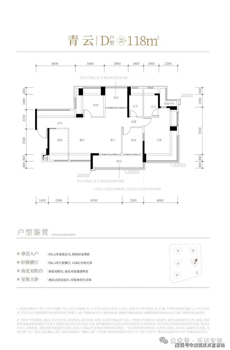 118㎡的4房2厅2卫,设计的是横厅南北通透格局,进门赠送约4.6㎡的入户玄关(不计算在户型图内),客餐厅6.35米开间,LDKB一体化设计,4个卧室分别做到了主卧22.5㎡/次卧11.56m²/次卧9.52㎡/次卧8.25㎡(包含墙体飘窗),主卧带设备平台,客厅连接次卧出6.25米长大阳台,L型厨房,得房率约81%(不含赠送),阳台主朝东南向。套内面积95.58m²+赠送面积31.04m²=实际使用面积126.62m²,加上赠送后得房率约107.3%。