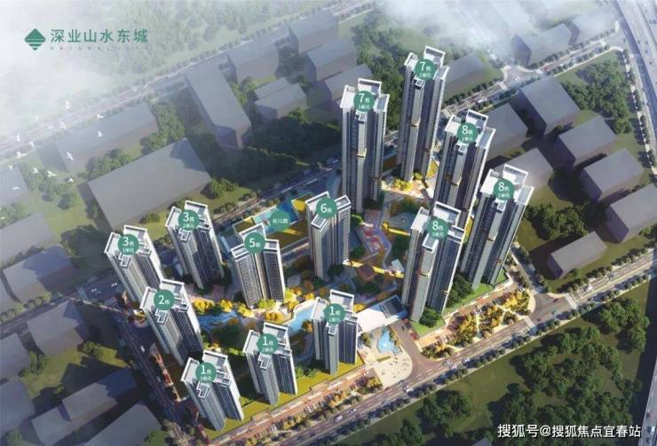 深业山水东城一期,总占地面积约4.16万㎡,总建筑面积约24万㎡,计容建筑面积约15.88万㎡,容积率2.33,绿化率21.14%,共由8栋总高32-33层的住宅组成,其中1栋1/2/3单元/3栋2单元住宅32F,2栋/3栋1单元/5栋/6栋住宅33F,4栋是1所21班制幼儿园,总规划1360户,全部是商品房住宅,其中5/6栋楼王单位2梯4户,其它栋数都是2梯6户设计。