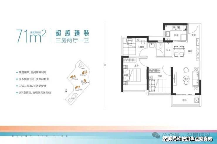 71㎡的3房2厅1卫,设计的是竖厅格局,餐客厅一体化,动静分区,客厅3.1米开间,分别做到了主卧10.64㎡/次卧7.83㎡/次卧7.56㎡(包含墙体飘窗),U型厨房,卫生间三段式分离设计,得房率:78.19%(不含赠送),阳台进深1.25米,有东北或西北向。套内面积55.71㎡+赠送6.55㎡=实用62.26㎡,实际得房率87.38%。