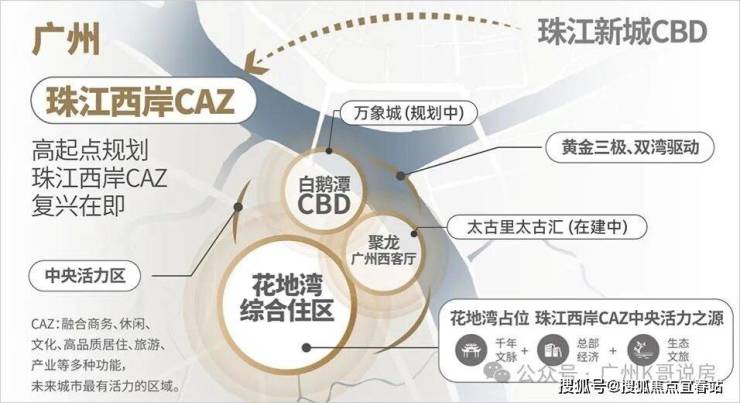 此外花地湾片区基本都是由万科统一开发,汇合白鹅潭-花地湾-聚龙组团的板块张力,白鹅潭核心区、聚龙组团、花地湾组团,于半径约2KM内构建珠江西岸CAZ黄金三极。