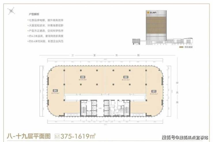 建面约303-732㎡滨海创意空间,约4.5-5.4米阔绰层高,格局方正通透,可根据需求自由创享。建面约375-1619㎡ 云端总部办公,约4.2米奢阔层高,约8.4米柱间距,180°全海景视野。