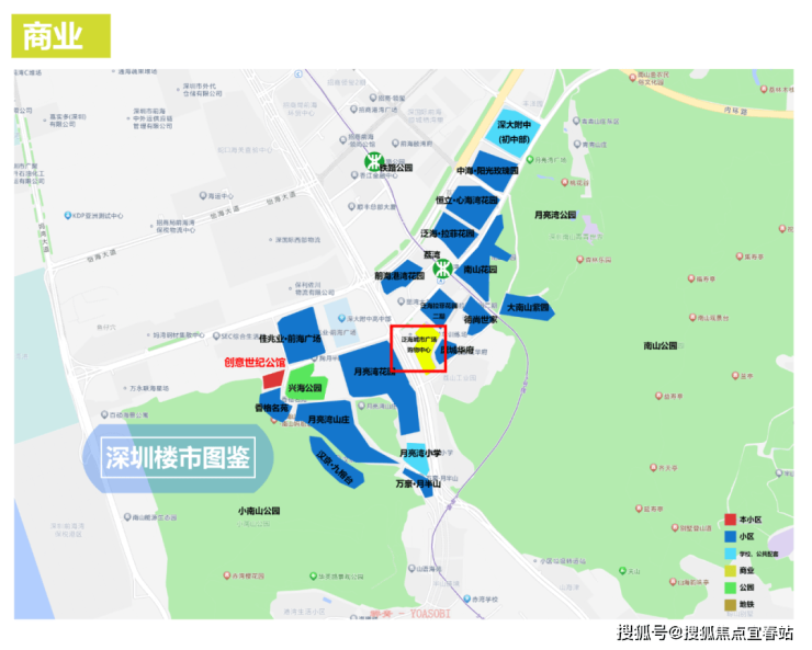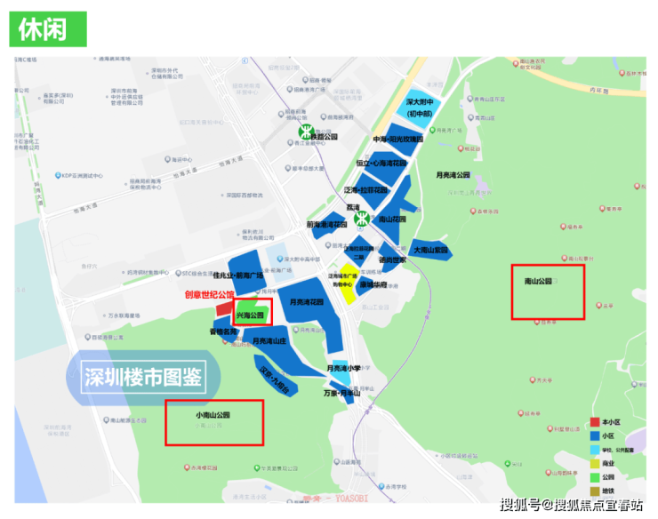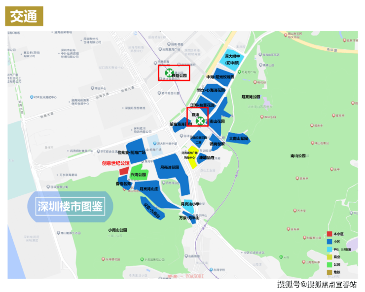 这是一块比较矛盾的片区,作为居住,拥有良好的伴山条件,恰好镶嵌在小南山公园和兴海公园之间,与香格名苑为邻。周边还有月亮湾山庄、月亮湾花园等老式大型住区,以及佳兆业前海广场、汉京九榕台等新兴社区。