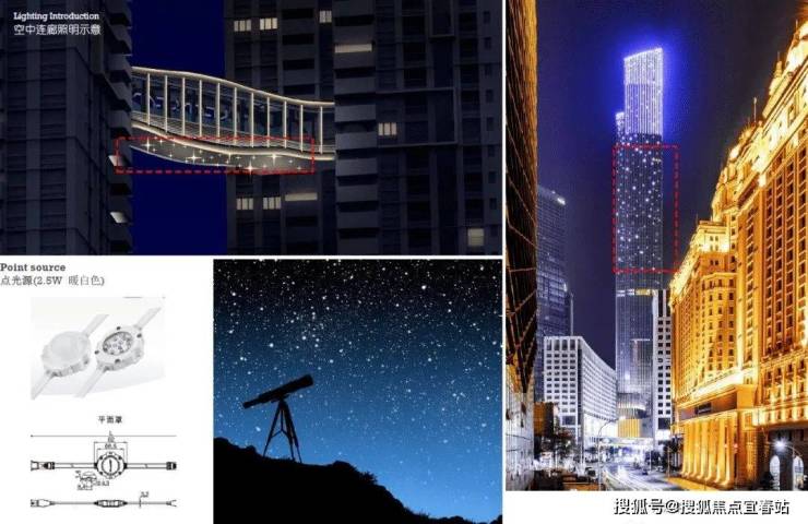 云玺锦庭是一座精心设计得恰到好处的建筑,空中廊桥、顶部的空中庭院,将原本独立的两栋建筑在高空连接起来,形成无障碍观景平台,是居民观看日落、欣赏城市夜景的绝佳去处。空中云厅采用满足适应活动的低照度,用一系列漫射、低矮的点光源进行装饰。连廊下层采用不锈钢进行装饰,利用精细工艺打磨出不同程度的哑光,从而映射出 “月下星光” 的光影意境。