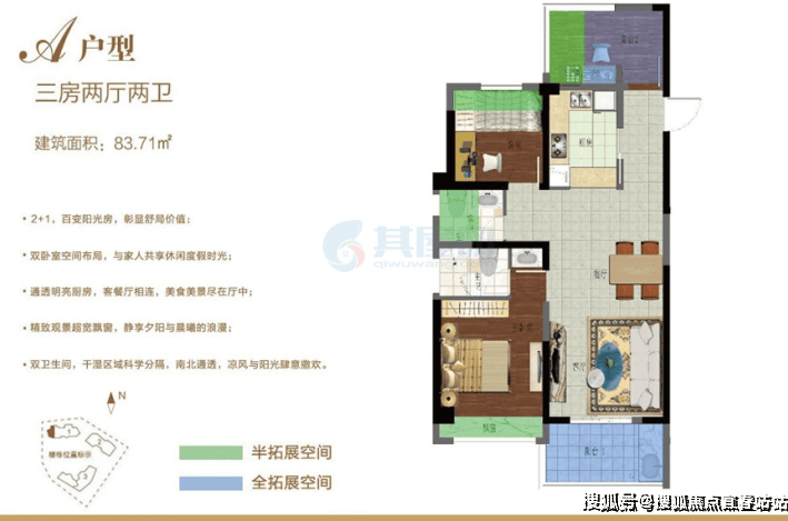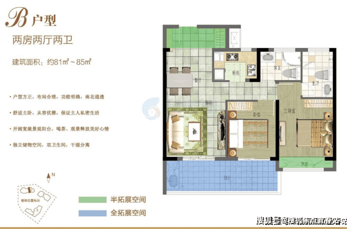 2# 楼在售户型:B 户型 85.36㎡两房两厅两卫;A 型 87.71㎡三房两厅。