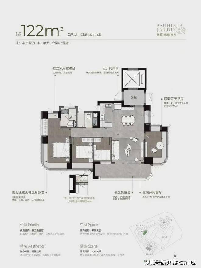 双龙抱珠户型,书房分布于客厅另一侧,且难得是双面采光+270°景观视野。主卧南北通透,且拥有十分开阔的景观面。贯通式阳台联通客厅以及靠近动区的次卧,实现长观景阳台。