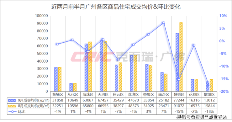在成交均价上,克而瑞数据监测显示,9月前半月(截至15日)广州商品住宅成交均价31493元/㎡,较8月前半月(截至15日)基本持平。
