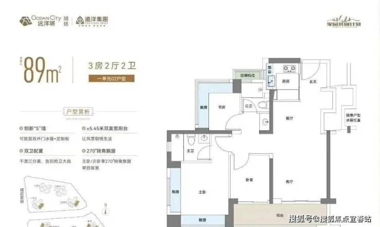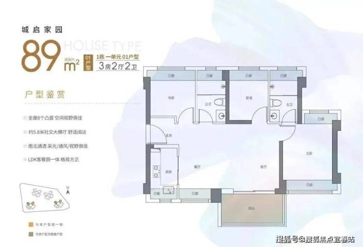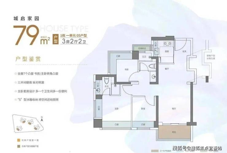 东南或西南朝向,竖厅设计,客厅有预留冰箱位,客厅,主卧,次卧分别朝南,户型一共有8个飘窗,加上阳台和飘窗使用率在90%左右。