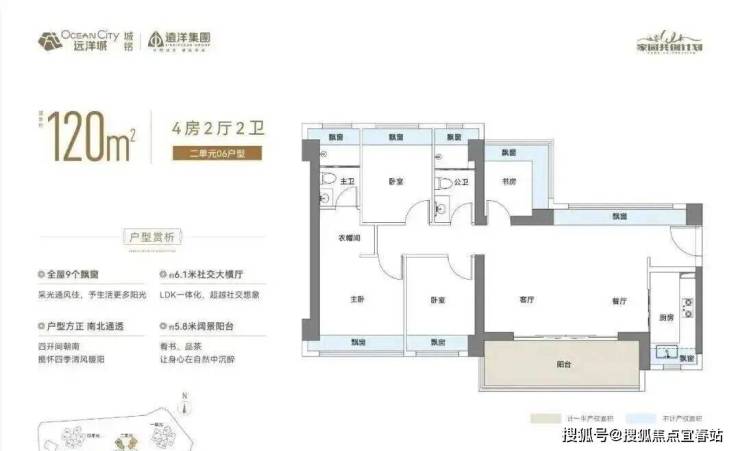 西南或东南向,户型是横厅南北通透格局,客餐厅5.8米开间,主卧双飘窗南北通设计,8个飘窗加阳台使用率在90%左右。