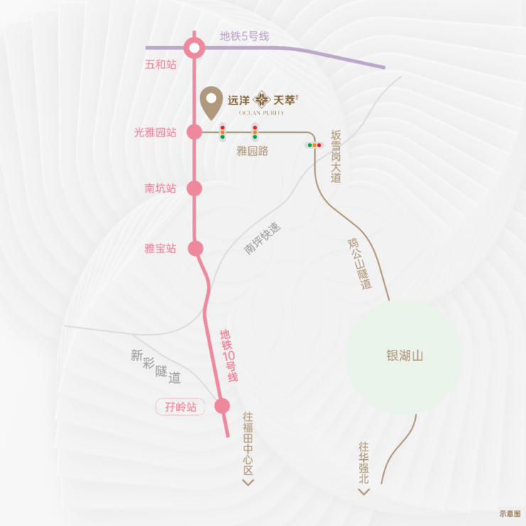 远洋天萃世纪地处龙岗区坂田街道核心,坐落坂田南板块,承接坂田科创产业与福田北辐射双重红利,周边科创企业集聚,素有“中国硅谷”美誉。楼下即地铁10号线光雅园站,无缝接驳地铁,可换乘5号线、深大城际,便捷通达福田、南山核心,自驾衔接布龙路、梅观高速,通勤优势显著。