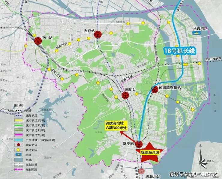 锦绣海湾城六期就在翠亨站旁300米处,根据之前规划,除了广珠城际,翠亨站还将连接 两条非常重要的线路:一是深珠通道联络线将接入翠亨站,高速公路部分同样在翠亨与东部外环高速相接,这意味着,将来从翠亨南部前往深圳,距离大大缩短。二是广州地铁18号线将接轨翠亨站,18号线是一条南北快线,去到的是广州珠江新城,最高达到160公里,号称“中国速度最快的地铁”,据悉广州段明年6月就建成通车,中山段已经进入实质性操作