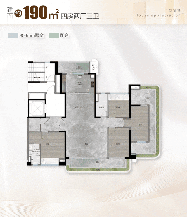 比如,奢阔大主套设计,配置环幕飘窗、独立卫浴、步入式衣帽间,尊奢感拉满。