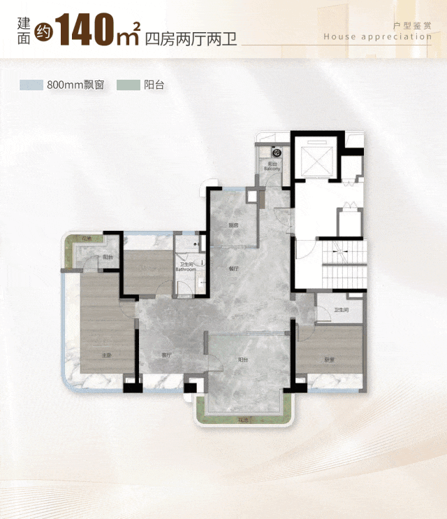 约120㎡四房,主卧270°飘窗,带衣帽间;南北双阳台,一面观景,一面晾晒。