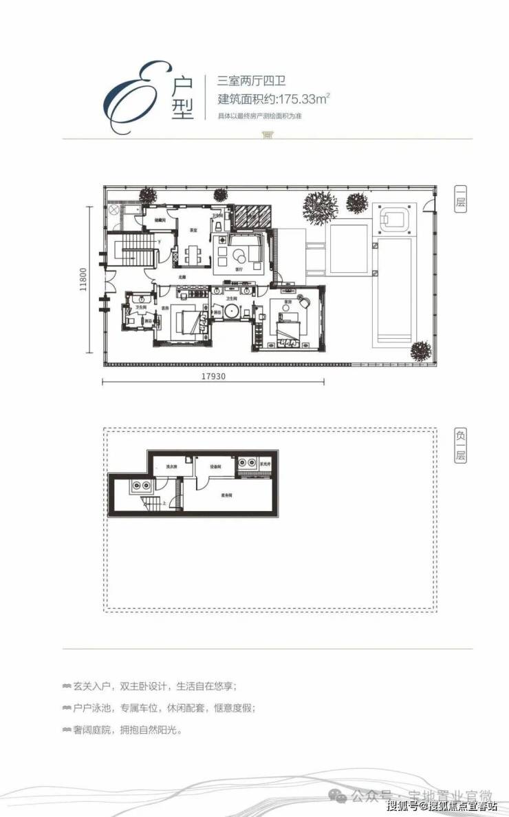 E户型规划面积约175㎡,实得约286㎡,院子190-480㎡