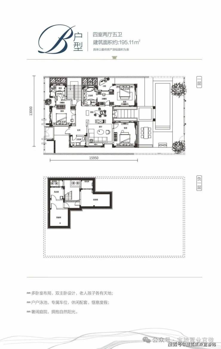 B户型规划面积约195㎡,实得约355㎡,院子约140-240㎡