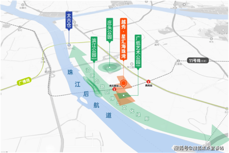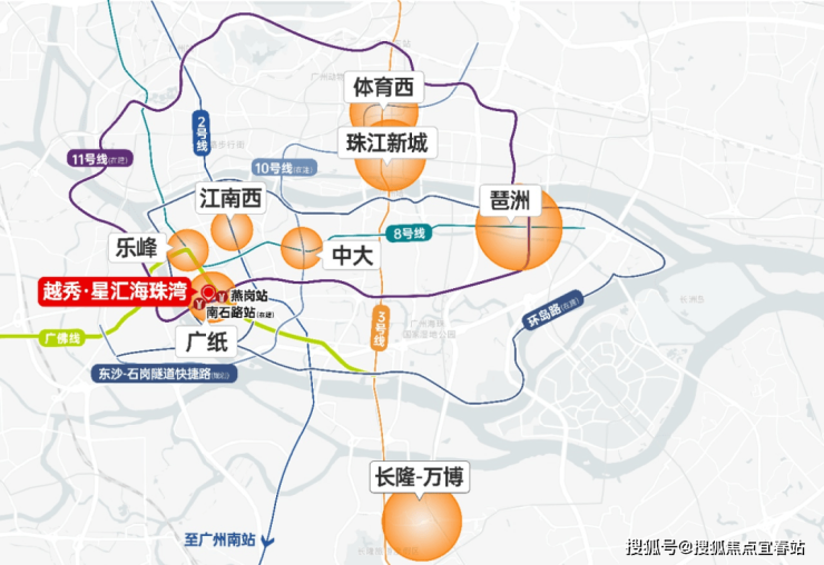 广州11号线(在建)贯穿项目,广州首条环城地铁,0换乘直达琵洲、广州火车站、广州东站;距广佛线燕岗站约450米,接入3号线,7站到达珠江新城;海珠环岛路(在建)工程进度不断刷新,价值即将兑现。