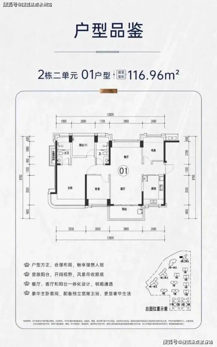 项目户型介绍:社区产品面积段包括112-116-120㎡4房2卫,195㎡4+1房4卫,本次推出116户型4房2卫