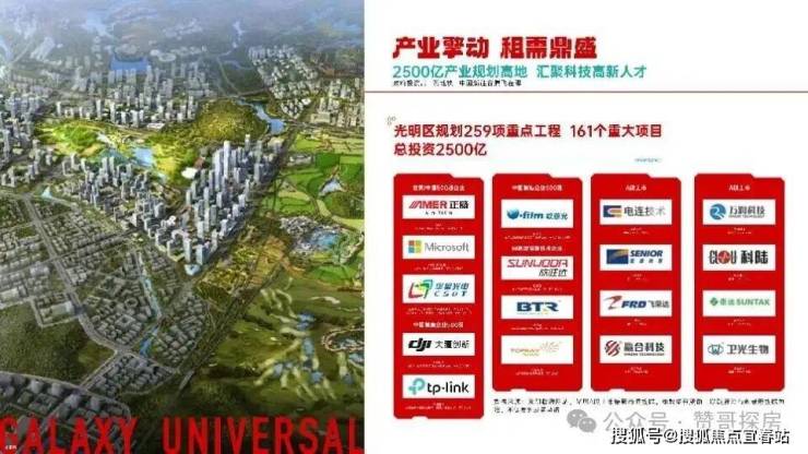 🎯产业擎动 租需鼎盛 l2500亿产业规划高低,汇聚科技高新人才2500亿产业规划高地 259项重点工程161个重大项目500强企业总部及知名企业:美国微软、杜邦太阳能,日本旭硝子、住友化学,英国葛兰素史克,德国林德气体;大疆、迈瑞医疗、莱宝高科、华星光电、普联(TP -Link)、欧菲光、蓝思科技、电连技术、星源材质、万润科技、飞荣达、赢合科技、科陆电子、崇达技术、卫光生物。片区预计将孵化高达100万高新科技人才。科技百强总部集群,聚集约100万高科技人才,高端公寓需求旺盛。* 数据来源:光明政府网站。光明A股上市最新市值数据。如数据有变动,以政府公布的最新数据为准。不做要约或者承诺。周边汇聚7家百亿龙头+30家上市企业汇聚(2025年)虹吸高精尖人才聚集,承接稳定高端租住需星河天地T19公寓|周边同质公寓月租2000-3000元,抢占星河天地T19就是抢占资产快车道。* 数据来源:本租金来源于安居客网站,具体的公寓出租租金以实际市场租金水平为准。