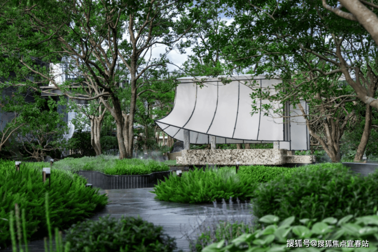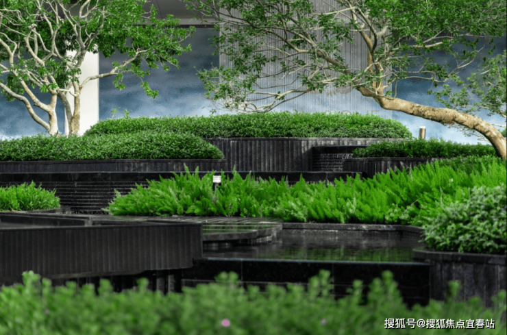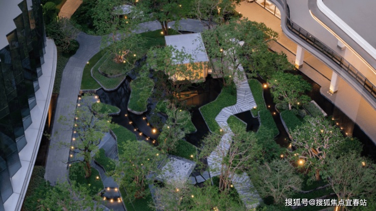 水流从入口叠水瀑布倾泻而下,奔向中央镜面水池,再沿着步道溪流蜿蜒流至全园各处,业主们沿着步道漫步,能依次体验 “听水的舒缓、观水的灵动、亲水的惬意”,这是传统平面园林没有的感受。