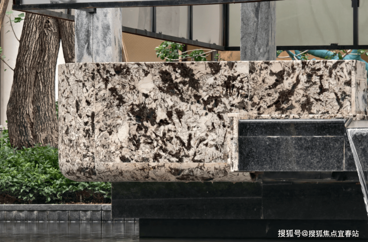 茶室底座,用的是巴西进口的雪山银狐奢石。这类奢石,因为独特的透光性,一般用于顶豪室内装饰,如今却被保利大胆用在园林公区,奢华程度可见一斑。