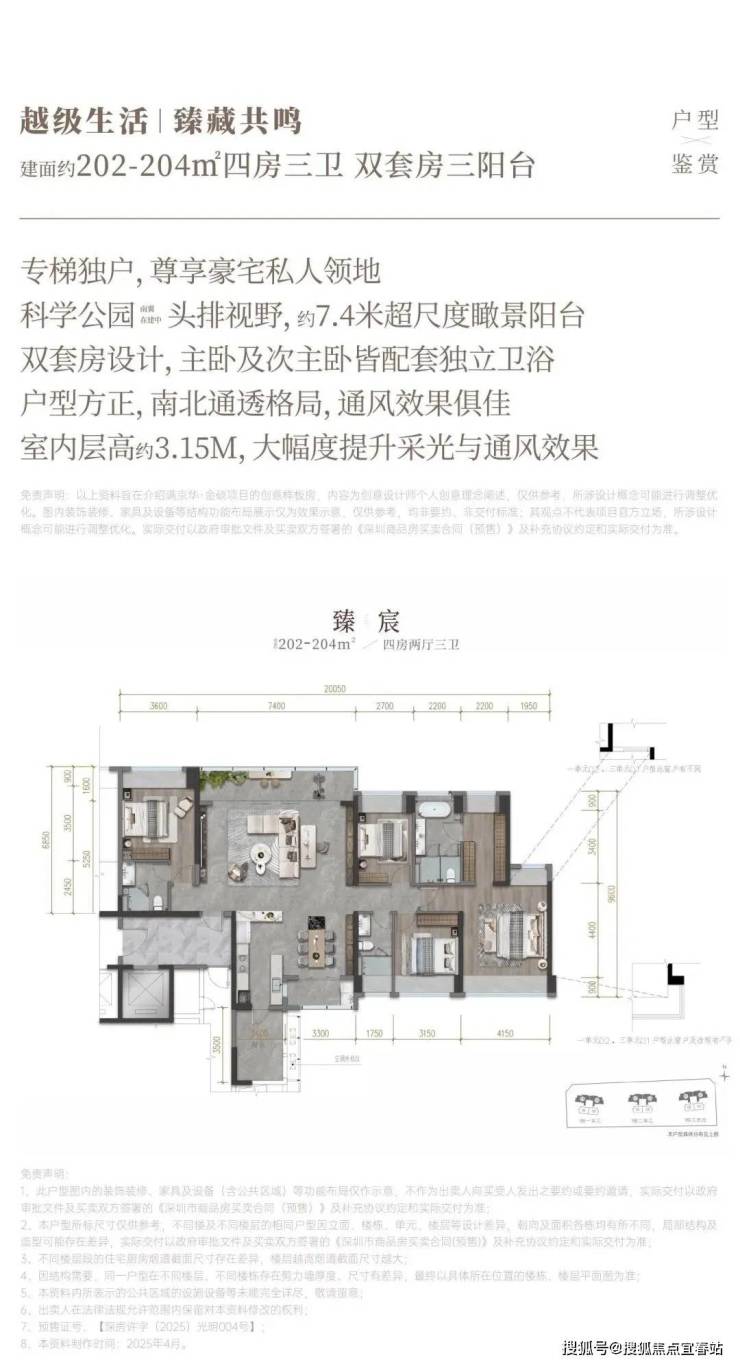 204㎡的4房2厅3卫,设计的是横厅南北通透格局,独立专梯入户,客餐厅7.4米开间,LDKB一体化,超大客厅+双套房设计,4个卧室分别做到了主卧33㎡/次卧16.1㎡/次卧13.54㎡/次卧11.61㎡(包含墙体飘窗),客餐厅出7.4米长的观景大阳台,直面科学公园,L型厨房带1个生活阳台,卫生间干湿分离,东北朝向。