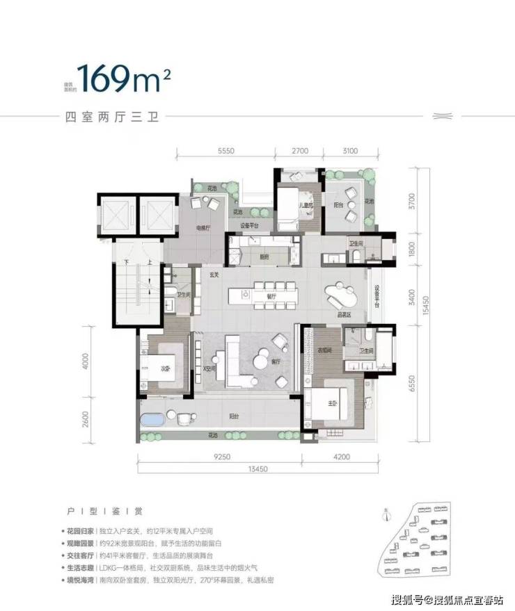 189 平米奢华四房,约 12.9 米宽景观阳台、LDKG 一体格局且社交双厨系统,空间奢阔。