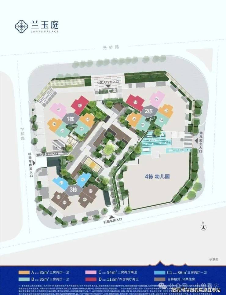项目共由3栋总高32-33F的住宅组成,另外规划1所九班制幼儿园,全部3梯6户,总规划558套,其中可售商品房434户,公共住房73户,自持租赁住房51户。