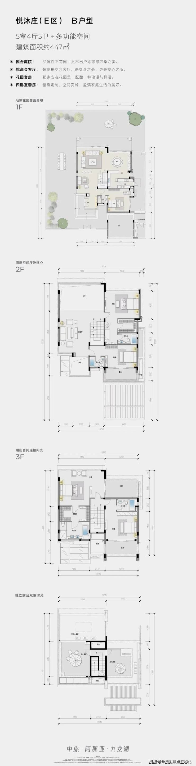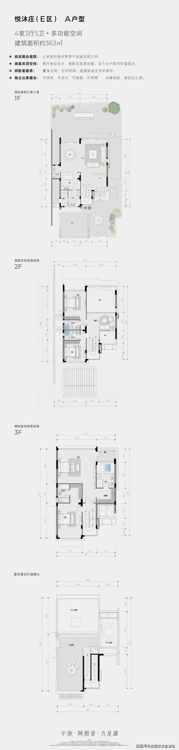 ✮产品面积:A户型(首层)195方-3房3厅4卫,B户型(二层)240方-3房3厅4卫,D户型(顶层)175方-3房3厅4卫,E户型(山景平层)170方-3房2厅3卫
