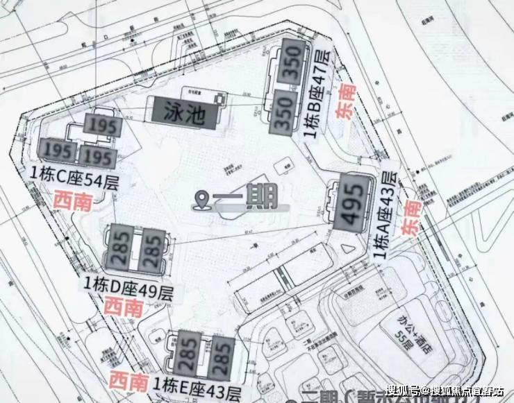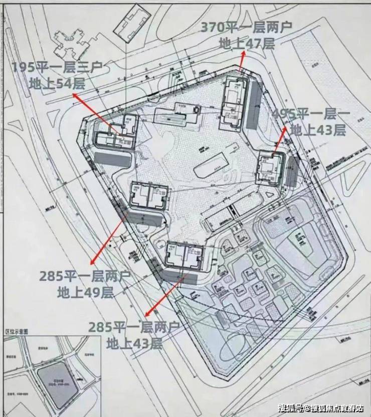 总楼层:1-1栋43层、1-2栋47层、1-3栋51层、1-4栋45层、1-5栋43层;